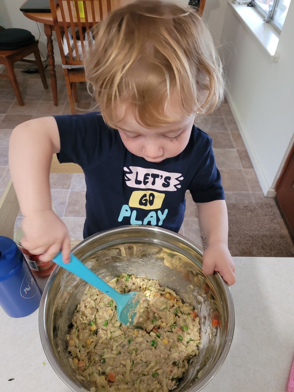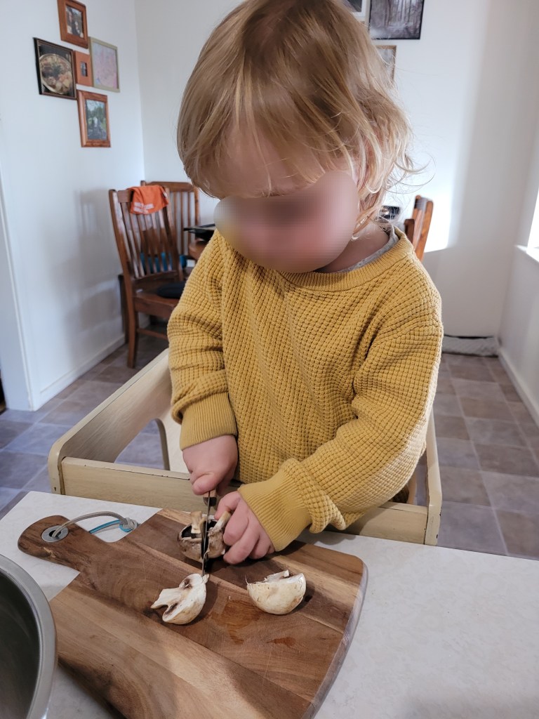 I use the time he is awake to do the dishes, organise dinner and in general tidy the house. He doesn’t suffer through this, he has lots to do around the house and often helps with dinner as he has his own knife and chopping board along with it being easy enough to include him in other tasks like putting all the vegetables I chopped up in a bowl, helping pour the spices, and chopping up the soft vegetables or fruits.