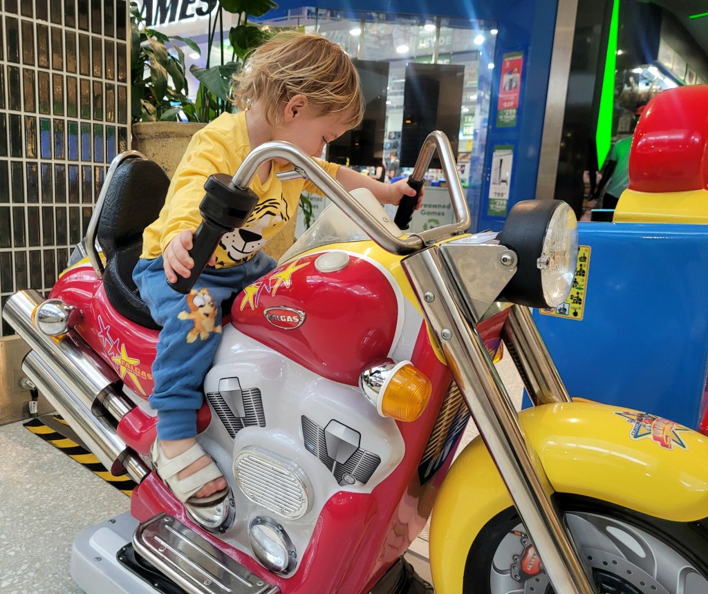 Monkey and Hubby enjoying a ride on car at the supermarket