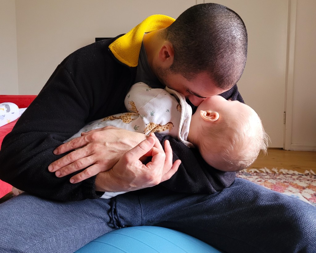 Holding your baby tight and bouncing up and down on the yoga ball would often calm down our Monkey. Sometimes, apart from breastfeeding this was only way to help calm Monkey down, and was often the only way people other than I could help him. The yoga ball would come with us wherever we went overnight, sometimes even if we knew we would be at a family members for most of a day.