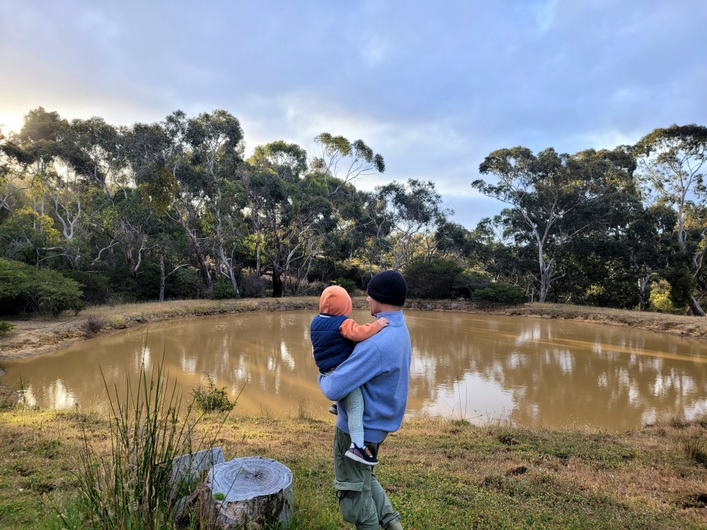 After dinner we bundled Monkey up and put him in the carrier, we used the walk to around the sheep paddock and the dam to calm Monkey down after he got to play with all the new toys, the sandpit and being around the campfire. Walking is also a big part of Hubby and my interactions, prior to having Monkey we would hike most weekends. Keeping Monkey in the carrier is important for us as it helps him relax but also helps us relax as we are able to go at our own pace, there is no chasing a toddler around and it is a great time to chat with little distraction.