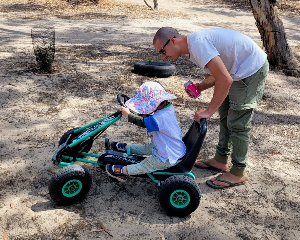 The campsite that Hubby picked has now set the bar too high for other Hipcamps. We picked The Scrub Campsite it as it was a large open site, giving Monkey lots of space to roam, there was a lovely view over the fenced dam and this campsite boasted spaces for children. It did not disappoint with a sandpit filled with diggers and other toys, basketball hoop, covered eating area and some buggies/bikes. There were walking trails into the sheep paddock, which was also full of kangaroos and a small loop around the dam.